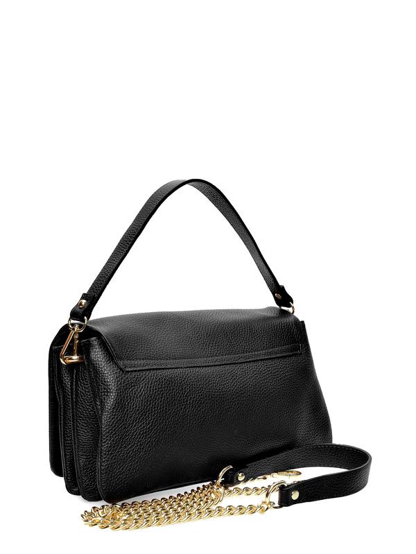 Shoulder bag 100% cow leather Flap with twist-lock closure Three compartments with fabric lining and internal zip pocket Detachable leather handle and additional chain strap Dimensions: 19 x 28 x 12 cm Handle: 20 cm Chain strap: 110 cm