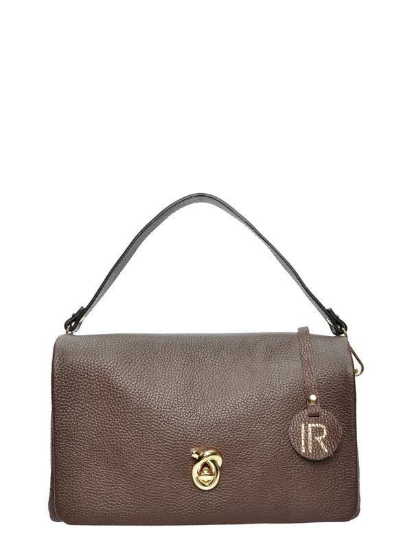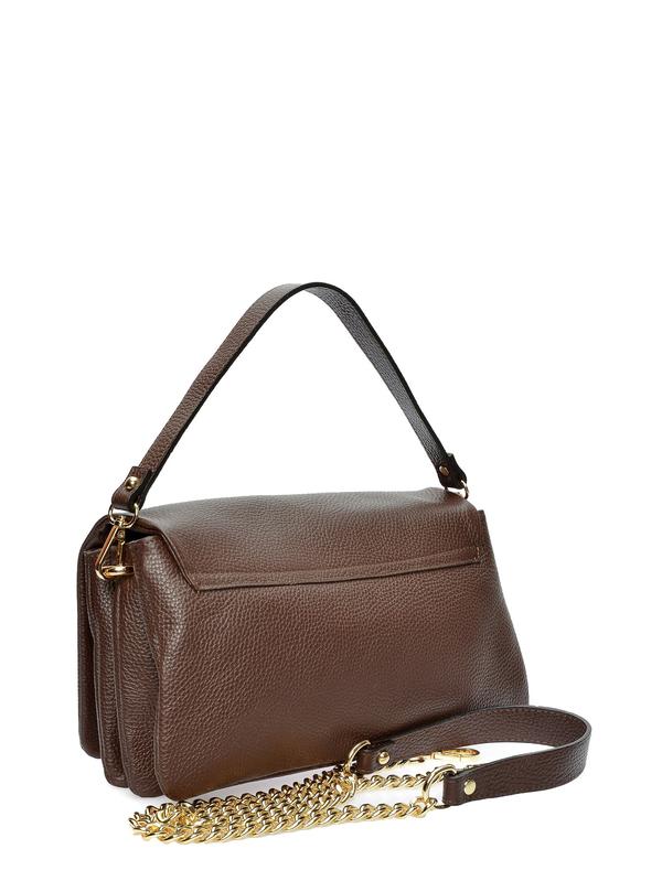 Shoulder bag 100% cow leather Flap with twist-lock closure Three compartments with fabric lining and internal zip pocket Detachable leather handle and additional chain strap Dimensions: 19 x 28 x 12 cm Handle: 20 cm Chain strap: 110 cm