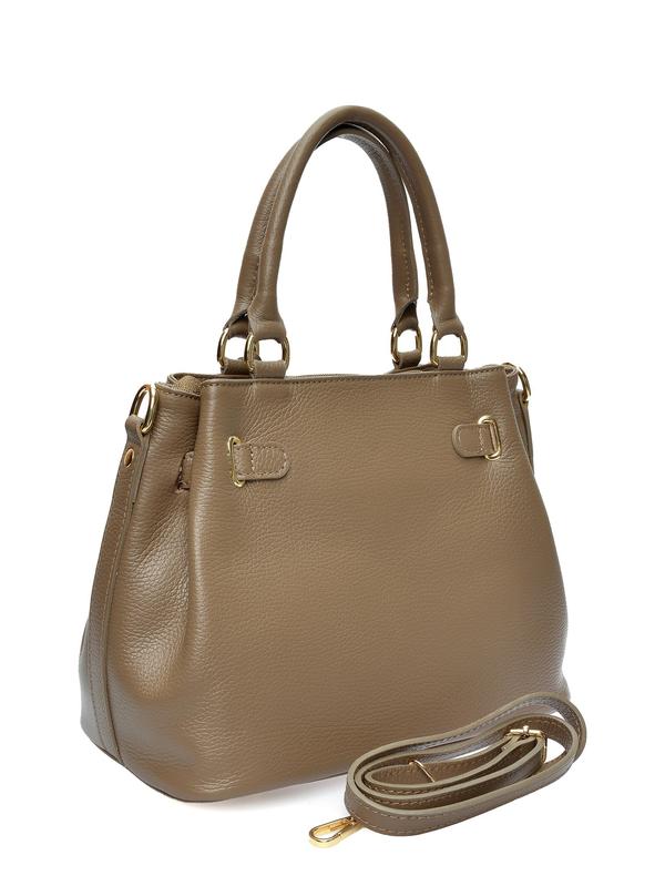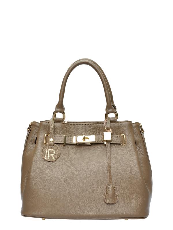 Top handle bag 100% cow leather Top zip closure with decorative turn lock and padlock detail Double handles and detachable shoulder strap Fabric lining with internal zip pocket and slip pocket Protective metal feet at the base Dimensions: 23.5 x 30 x 16.5 cm Handle: 30 cm Strap: 120 cm adjustable and detachable