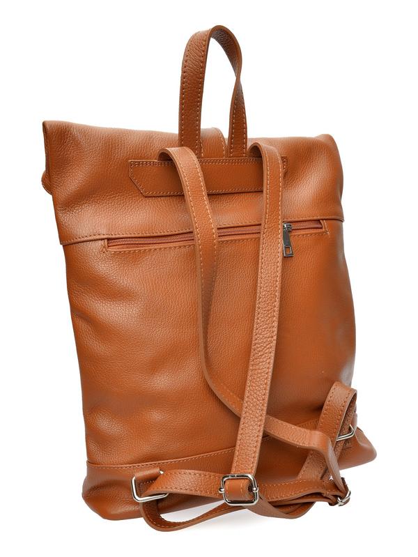 Backpack 100% cow leather Magnetic flap with buckle detail and top zip closure Front external zip pocket and back external zip pocket Fabric lining with internal zip pocket Dimensions: 40 x 34 x 10 cm Handle: 28 cm Adjustable leather shoulder straps 90x2 m