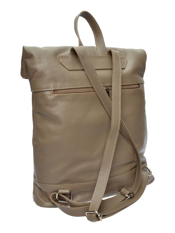 Backpack 100% cow leather Magnetic flap with buckle detail and top zip closure Front external zip pocket and back external zip pocket Fabric lining with internal zip pocket Dimensions: 40 x 34 x 10 cm Handle: 28 cm Adjustable leather shoulder straps 90x2 m