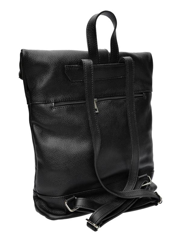 Backpack 100% cow leather Magnetic flap with buckle detail and top zip closure Front external zip pocket and back external zip pocket Fabric lining with internal zip pocket Dimensions: 40 x 34 x 10 cm Handle: 28 cm Adjustable leather shoulder straps 90x2 m