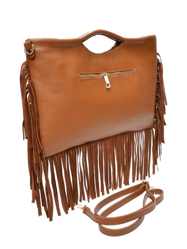 Handbag 100% cow leather Top zip closure Front external zip pocket Fringe detailing on sides and bottom Fabric lining with internal zip pocket Dimensions: 25 x 37 x / cm Handle: 13.5 cm Shoulder strap: 120 cm adjustable and detachable