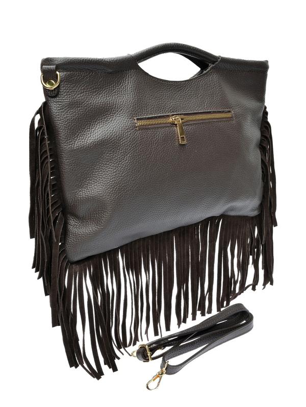 Handbag 100% cow leather Top zip closure Front external zip pocket Fringe detailing on sides and bottom Fabric lining with internal zip pocket Dimensions: 25 x 37 x / cm Handle: 13.5 cm Shoulder strap: 120 cm adjustable and detachable