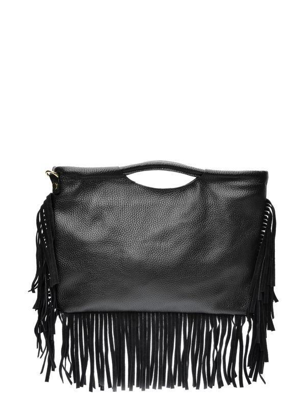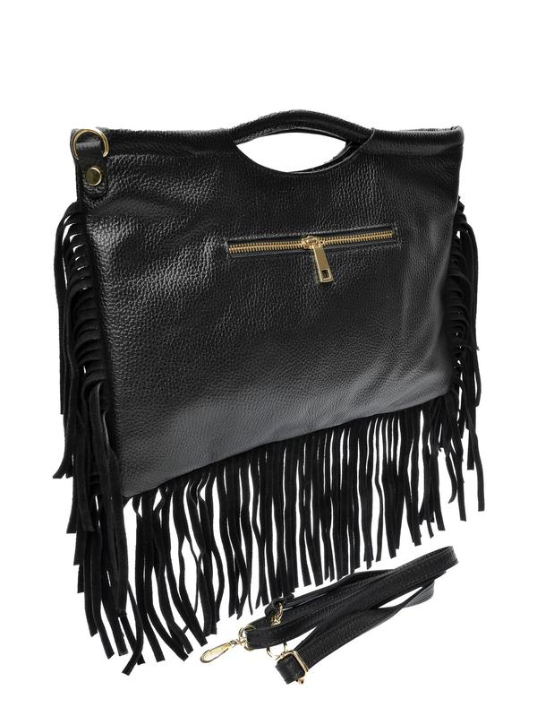 Handbag 100% cow leather Top zip closure Front external zip pocket Fringe detailing on sides and bottom Fabric lining with internal zip pocket Dimensions: 25 x 37 x / cm Handle: 13.5 cm Shoulder strap: 120 cm adjustable and detachable