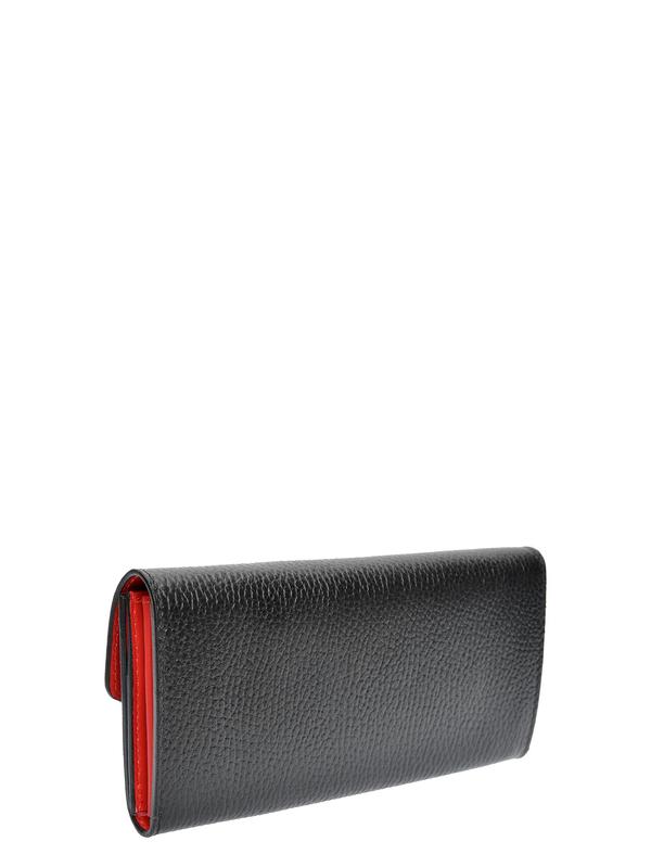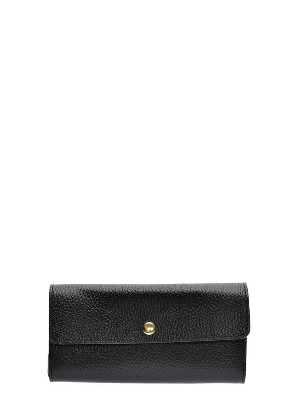 Wallet 100% cow leather Flap with snap button closure Multiple card slots, bill compartments, and internal zip coin pocket Contrasting red interior lining Dimensions: 8.5 x 18.5 x 3 cm