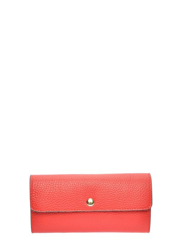 Wallet 100% cow leather Flap with snap button closure Multiple card slots, bill compartments, and internal zip coin pocket Contrasting red interior lining Dimensions: 8.5 x 18.5 x 3 cm