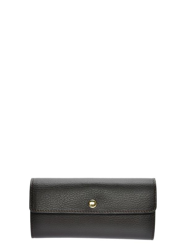 Wallet 100% cow leather Flap with snap button closure Multiple card slots, bill compartments, and internal zip coin pocket Contrasting red interior lining Dimensions: 8.5 x 18.5 x 3 cm