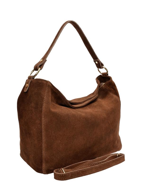 Shoulder bag 100% cow suede leather Top zip closure Gold-tone hardware Fabric lining with internal zip pocket Removable and adjustable long strap Dimensions: 27 x 32 x 11 cm Handle drop: 38 cm Strap: 115 cm adjustable