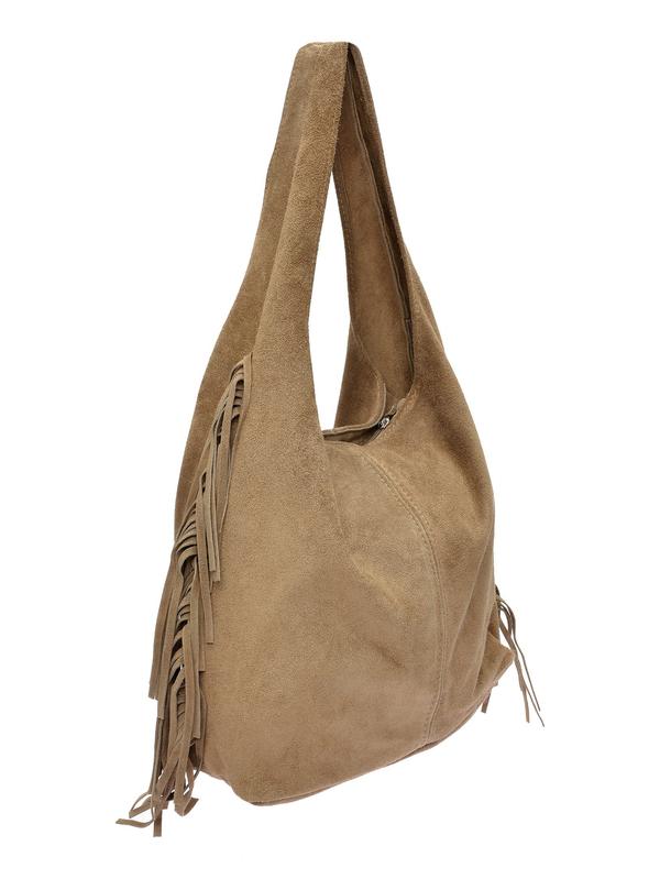 Hobo bag 100% cow leather (suede) Open top with magnetic closure Fringed side details Unlined interior with internal zip pocket Dimensions: 30 x 39 x 12 cm Handle drop: 50 cm