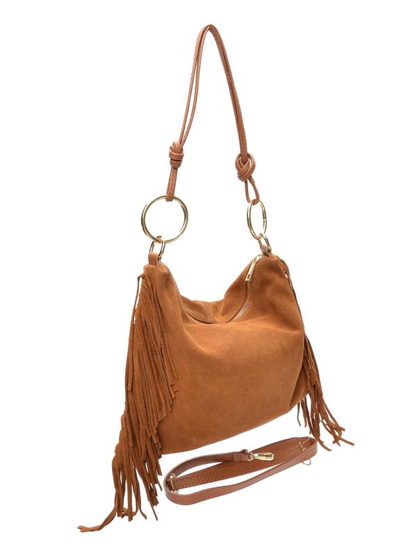 Shoulder bag 100% suede leather Top zip closure Fabric lining with internal zip pocket Detachable and adjustable leather shoulder strap Fringe side details with gold-tone ring attachments Dimensions: 26.5 x 36.5 x / cm Handle: 60 cm Shoulder strap: 120 cm adjustable