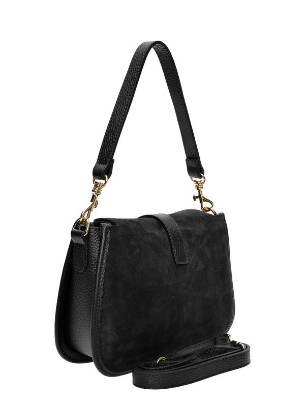 Handbag 100% suede leather Flap with twist-lock metal closure Fabric lining with internal zip pocket Dimensions: 17.5 x 24 x 6.5 cm Handle: 44 cm Shoulder strap: 120 cm adjustable and detachable