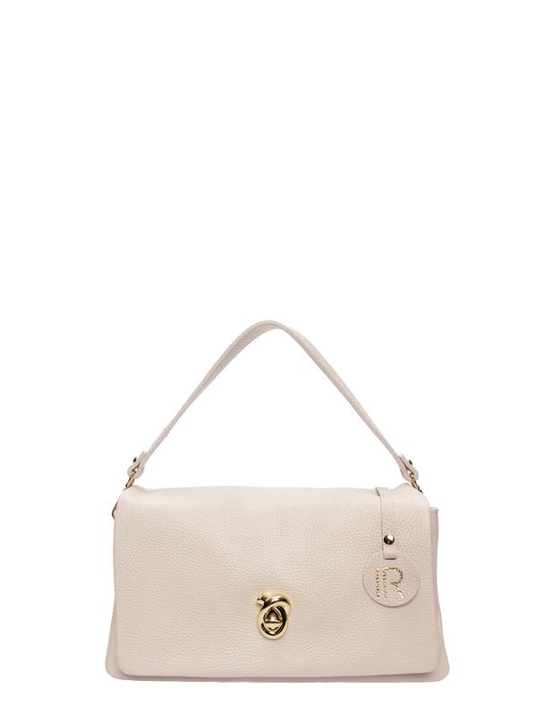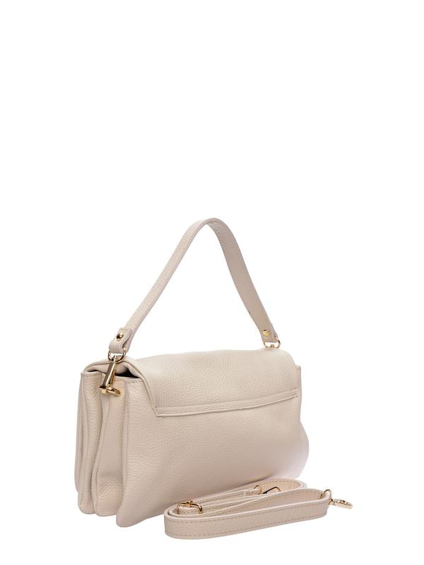 Shoulder bag 100% cow leather Flap with twist-lock closure Three compartments with fabric lining and internal zip pocket Detachable leather handle and additional chain strap Dimensions: 19 x 28 x 12 cm Handle: 20 cm Chain strap: 110 cm