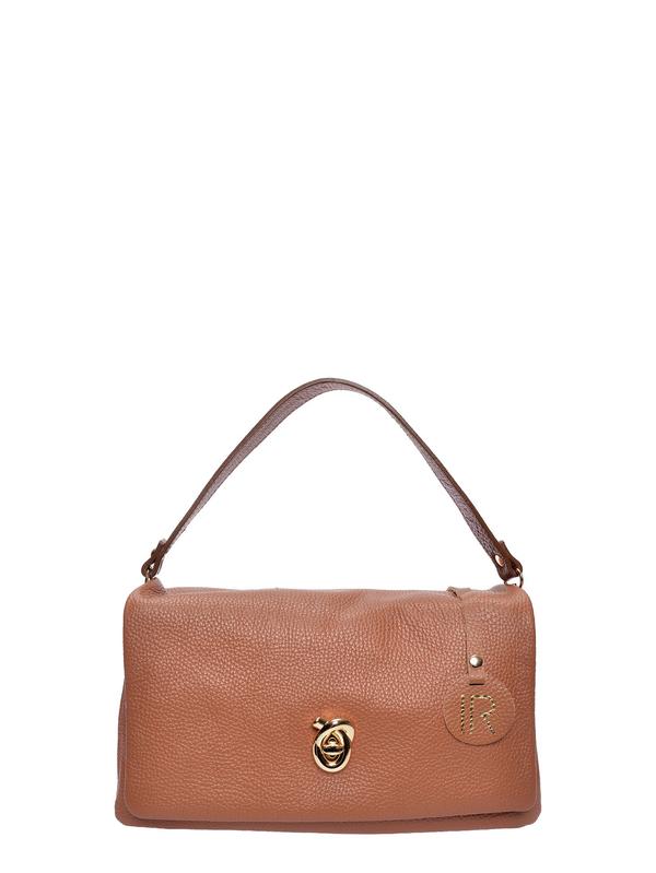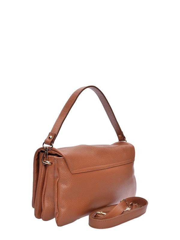 Shoulder bag 100% cow leather Flap with twist-lock closure Three compartments with fabric lining and internal zip pocket Detachable leather handle and additional chain strap Dimensions: 19 x 28 x 12 cm Handle: 20 cm Chain strap: 110 cm