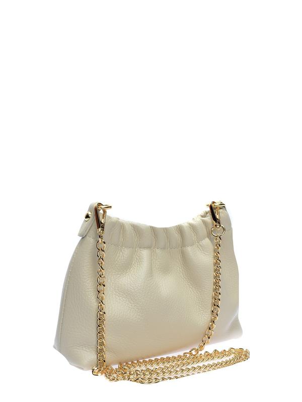 Crossbody bag 100% cow leather Magnetic snap closure Cotton lining with open pocket Gold-tone chain strap Dimensions: 15 x 21 x 6 cm Strap: 120 cm non-adjustable chain