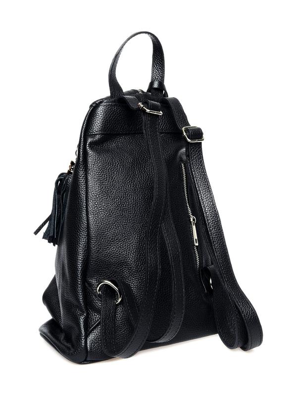 Backpack 100% cow leather Front zip closure Inner zip pocket Back zip pocket Tassel detail Dimensions (L): 43.5x35x17 cm Handle: 24cm Shoulder strap: 80cm x 2 cm