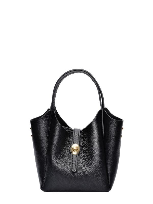 Tote bag 100% cow leather Top zip closure with front metallic buckle closure Internal zipped compartment Handle: 24 cm Shoulder strap : 120 cm adjustable and removable Dimensions: 14x16x10 cm